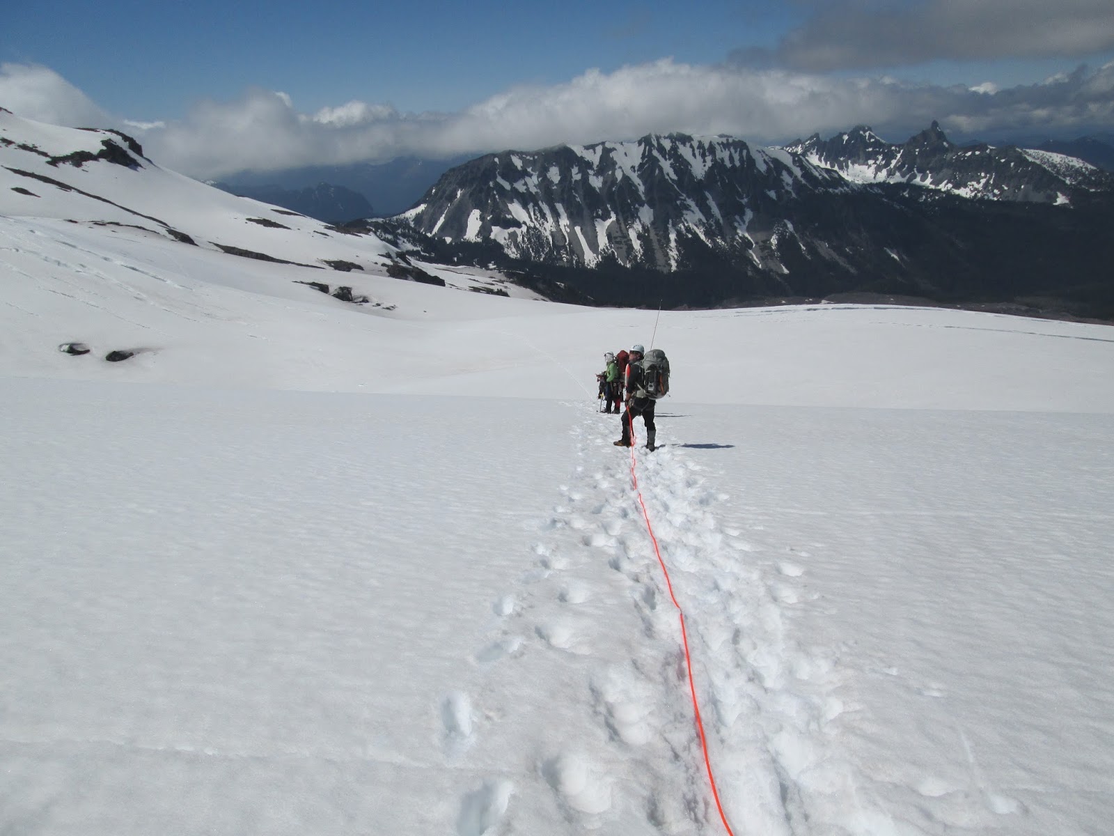 The reality, however, was that James is a good deal heavier than us, and the crevasse danger on the Carbon glacier is real. Darrin and I might have had problems if James took a fall. For that reason we added a second rope team to the party, consisting of three other climbers: Nao Takano, Keegan Young and John Fatseas.
