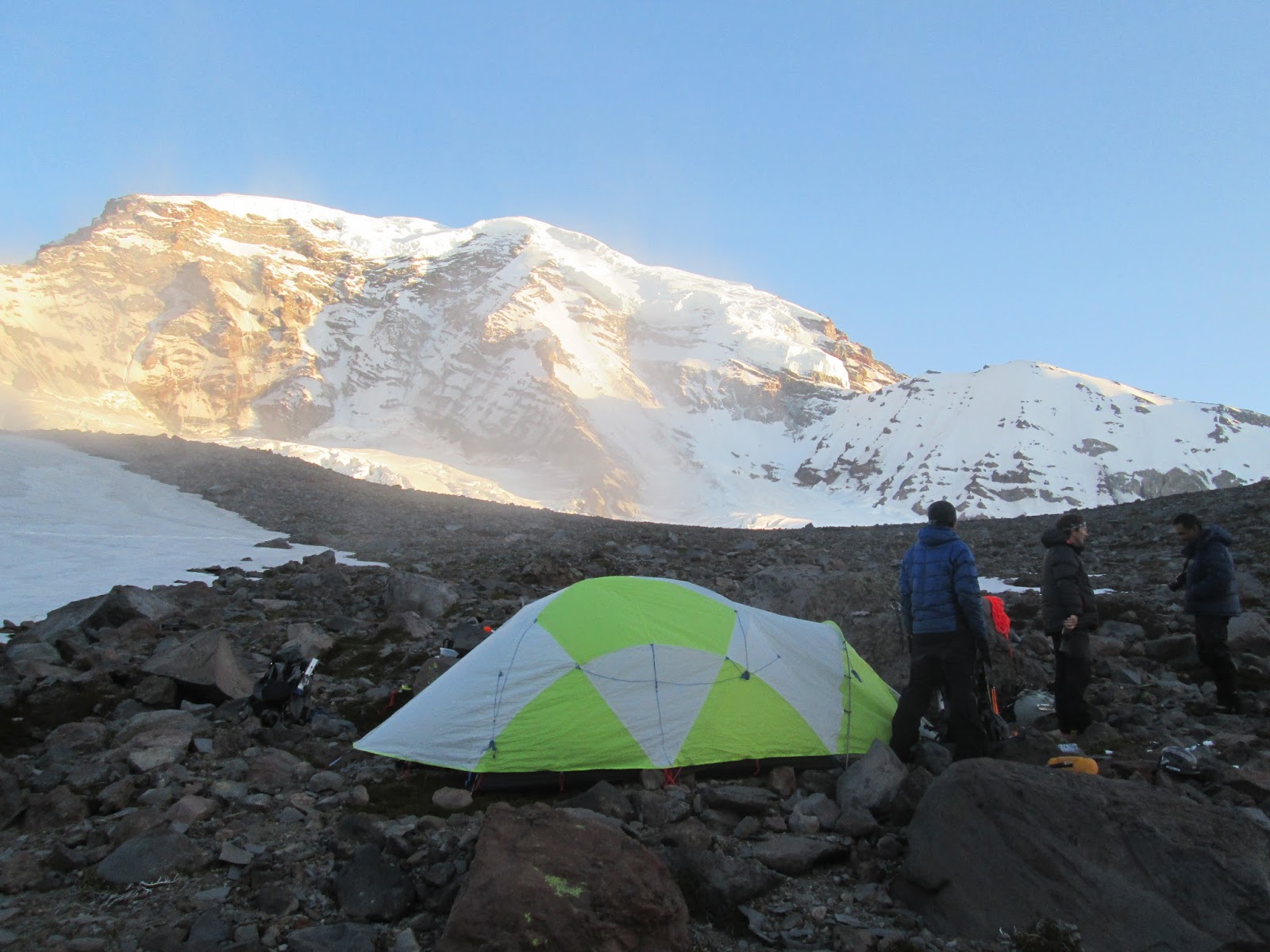 | Curtis Ridge Camp, with Liberty Ridge partly shrouded behind |