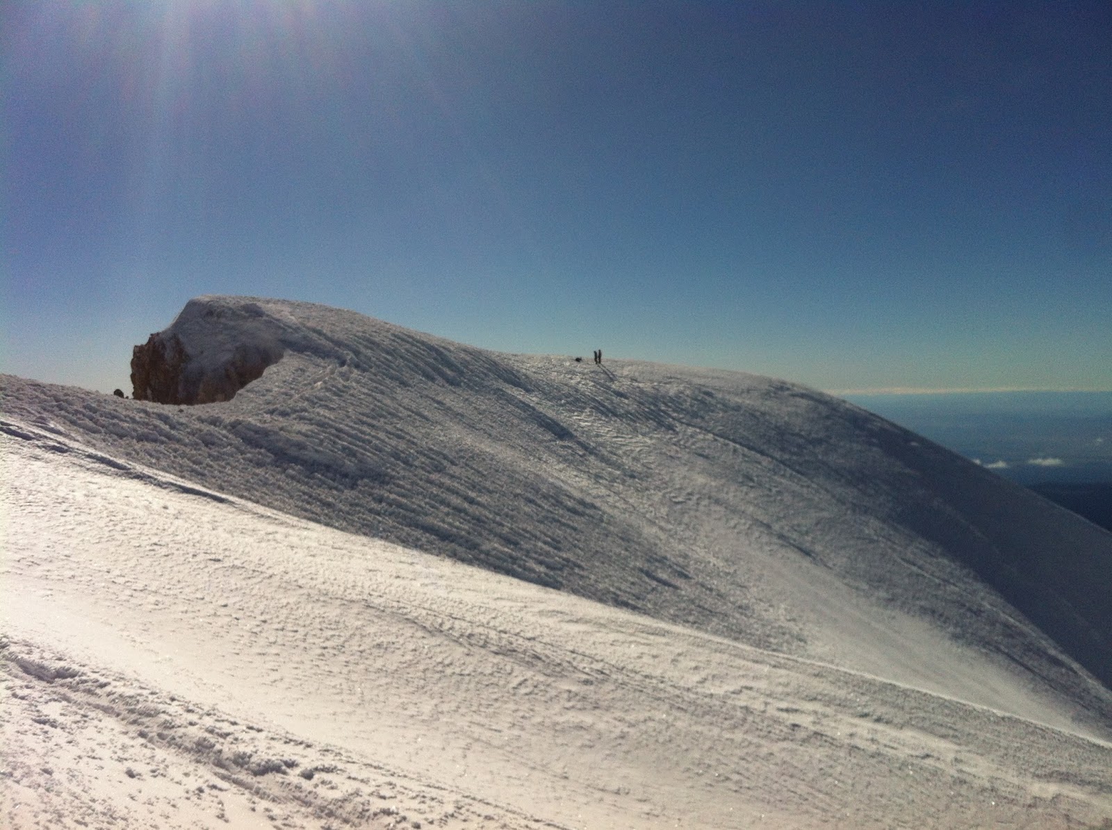 After turning around on Liberty Ridge, my chest swelled with the elation of success. I put on my puffy and was soon joined by the other groups, including the Aspenites, who skied from the summit. Bill and James arrived a short while later. Standing at the apex of a mountain like Hood is an awesome personal accomplishment, but it wouldn’t mean nearly as much without friends such as these to share the victory. I spent a few minutes gazing longingly at Rainier, though I didn’t dwell; I was happy where I stood.
