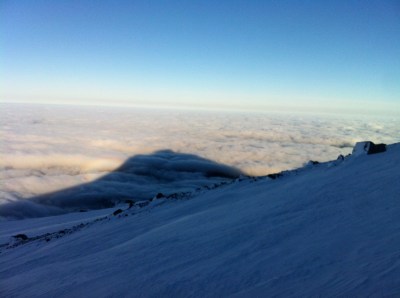 The first 2,500’ of the route is as boring as snow climbing gets. One literally walks up a ski slope, using a chairlift as a guide. The views we had that morning made even that portion enjoyable. The entrapping cloudlayer leveled off at about 6,000 feet, the same elevation as the trailhead. We were soon above it. Sunrise hit early because of our late start, and it presented an astounding scene coupled with the low clouds, nearby Mt. Jefferson and Hood’s own mountain shadow.