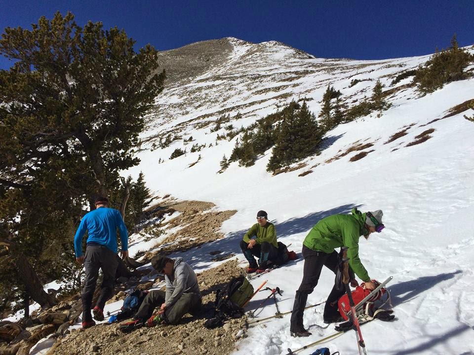 The group started from the lower trailhead at 6:45 a.m., faced with a few miles of road walking before reaching the standard summer starting point. Snowshoes weren’t necessary and the distance melted away. As the day grew warmer and the sun burned off the early-morning clouds, some of us even found ourselves in baselayers. Of course, with a storm scheduled to roll in during the afternoon and high winds obvious up high, we knew it wouldn’t last.